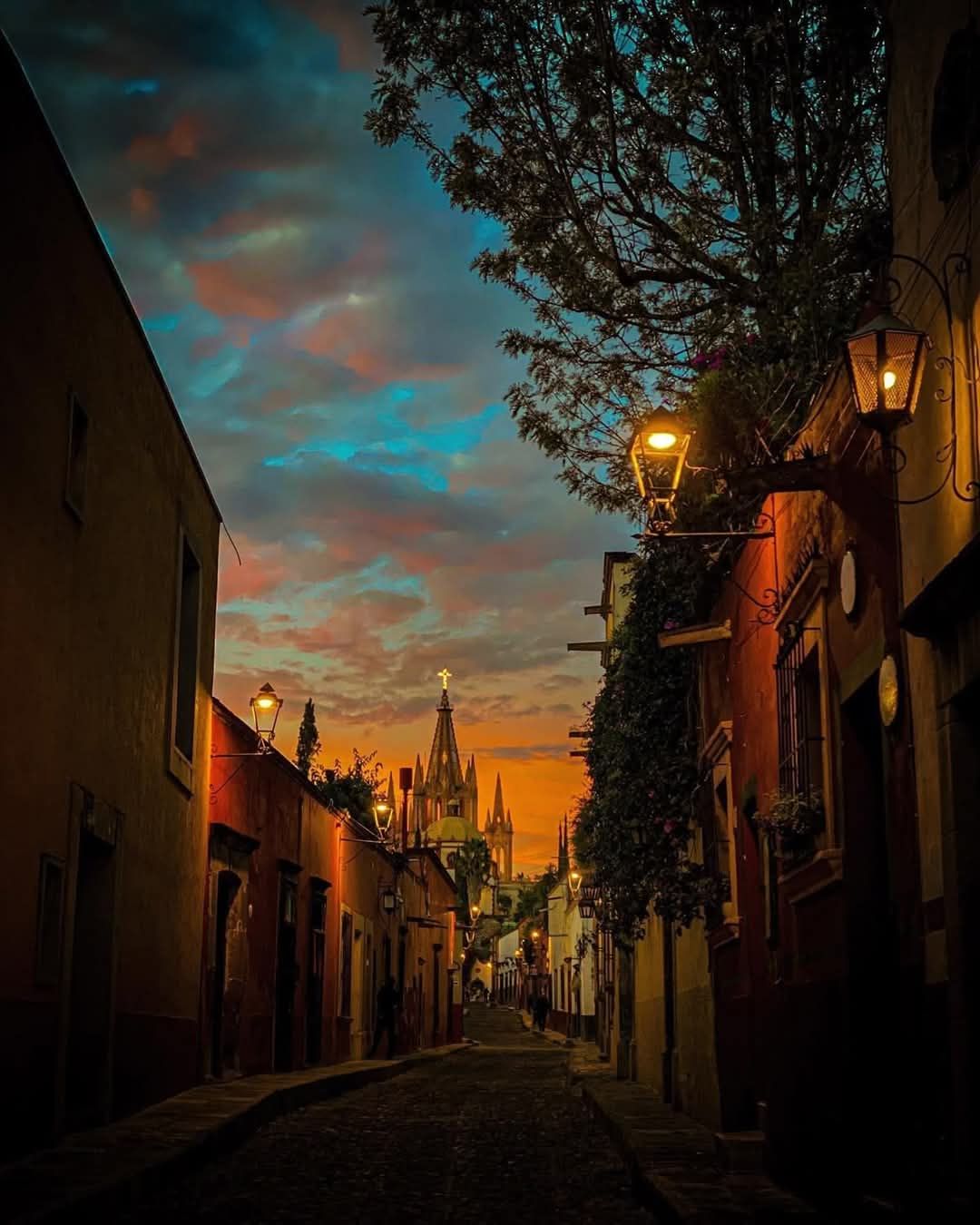 And yet, what steals my breath isn’t just the sky — though on a night like this, it’s a cathedral of its own, brushed in indigo and burning apricot as if the heavens themselves had paused to gaze at the Parroquia’s spires in admiration. No, it’s the way the light holds the callejón like a secret.