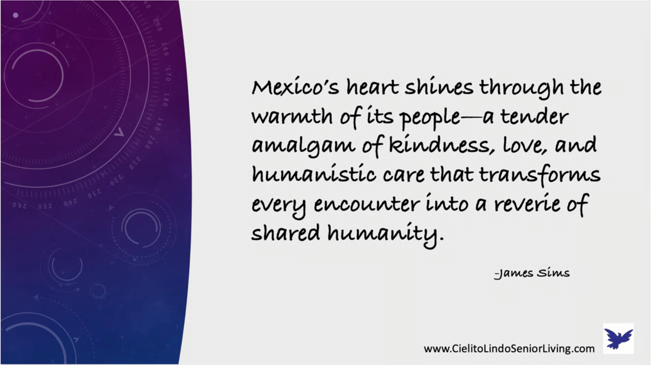 Caregiver’s Sentiment: The True Warmth of Mexico This quote, “Mexico’s heart shines through the warmth of its people, a tender amalgam of kindness, love, and humanistic care that transforms every encounter into a reverie of shared humanity”, is a poetic testament to the soul of Mexican caregiving culture. It recognizes not just the service offered, but the spirit in which it is given. In a world often driven by efficiency and detachment, this sentiment elevates the value of emotional presence, revealing how the human touch can become a profound act of healing. The use of words like “tender,”