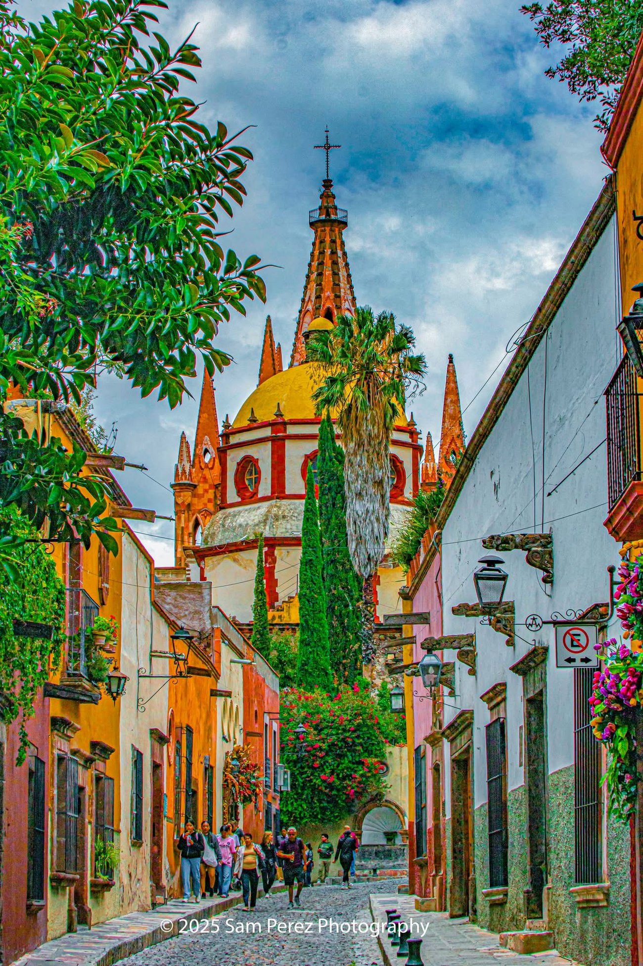 This callejón — Cuesta de San José — curls upward like the opening line of a fairytale with the iconic La Parroquia in the background. The kind of street where you half-expect to see a violinist playing from a wrought iron balcony or a trail of marigold petals left behind by a quiet procession. The houses wear their colors with a kind of theatrical pride: deep mango, faded rose, soft creams, and dusky orange — each one holding secrets behind its carved doors and heavy knockers. And beyond them all, like a dream crescendo, rises La Parroquia, the pink gothic spires haloed by cypress and cloud.
