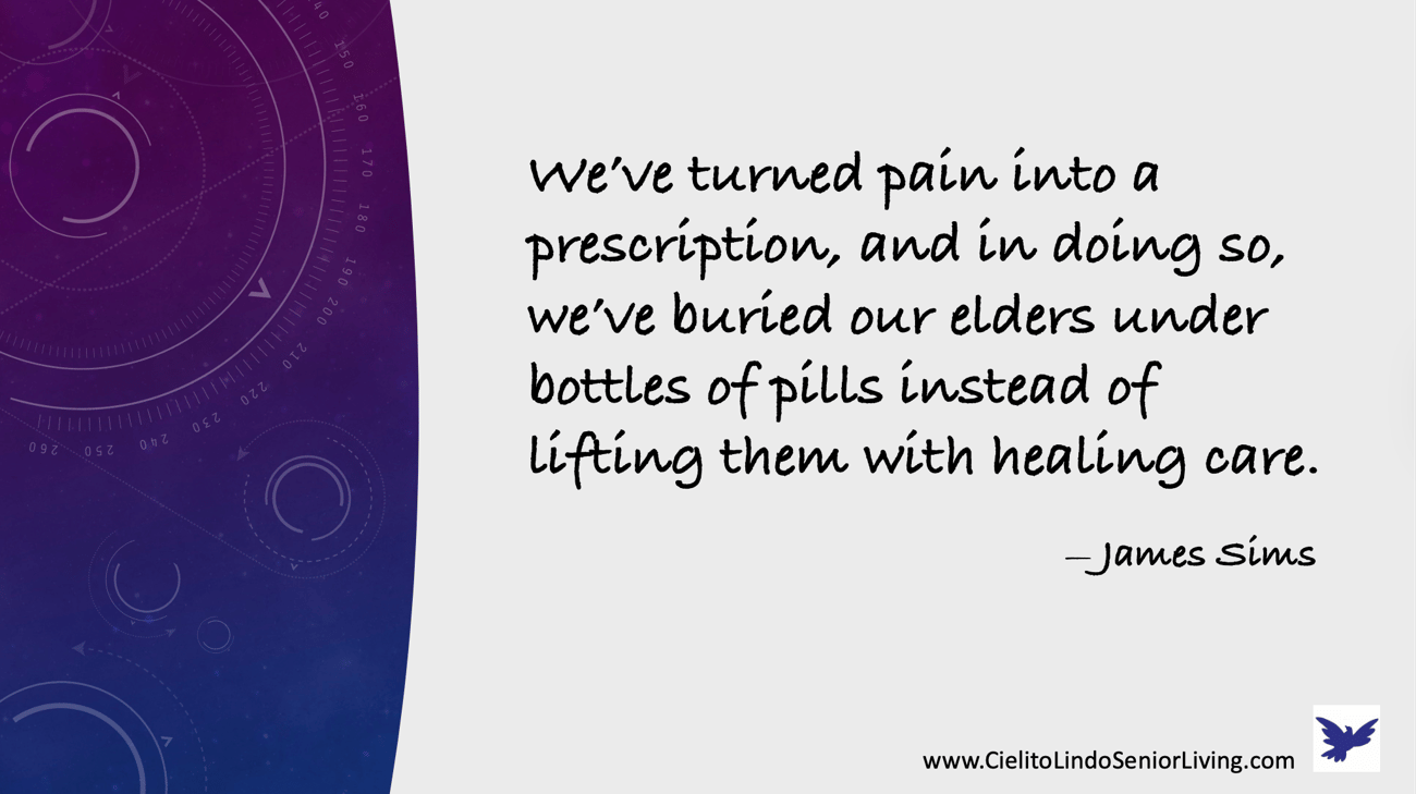 And when I follow that with “we’ve buried our elders under bottles of pills instead of lifting them with healing care,” I’m not using metaphor lightly.