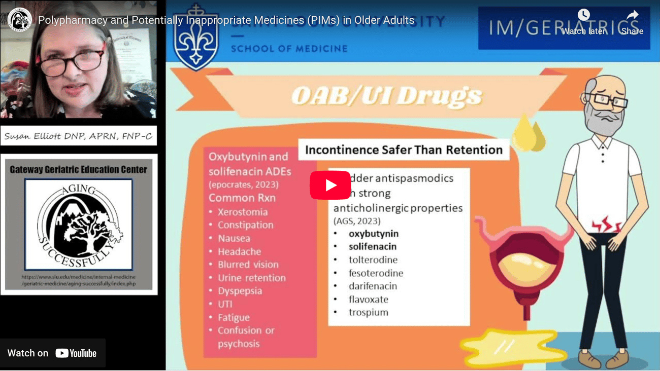 0:00 – Introduction by Susan Elliott, nurse practitioner at St. Louis University, discussing polypharmacy and potentially inappropriate medications (PIMs) in older adults.
